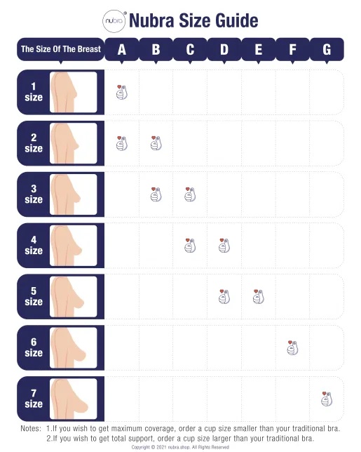 Size up for more coverage: If you wish to get maximum coverage or total support, order a cup size smaller than your traditional bra.APPLYING NUBRA IS AS EASY AS 1 • 2 • 3 • 4